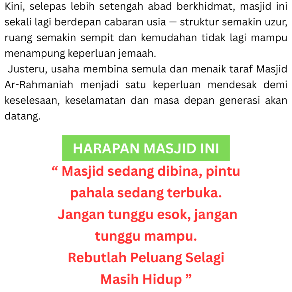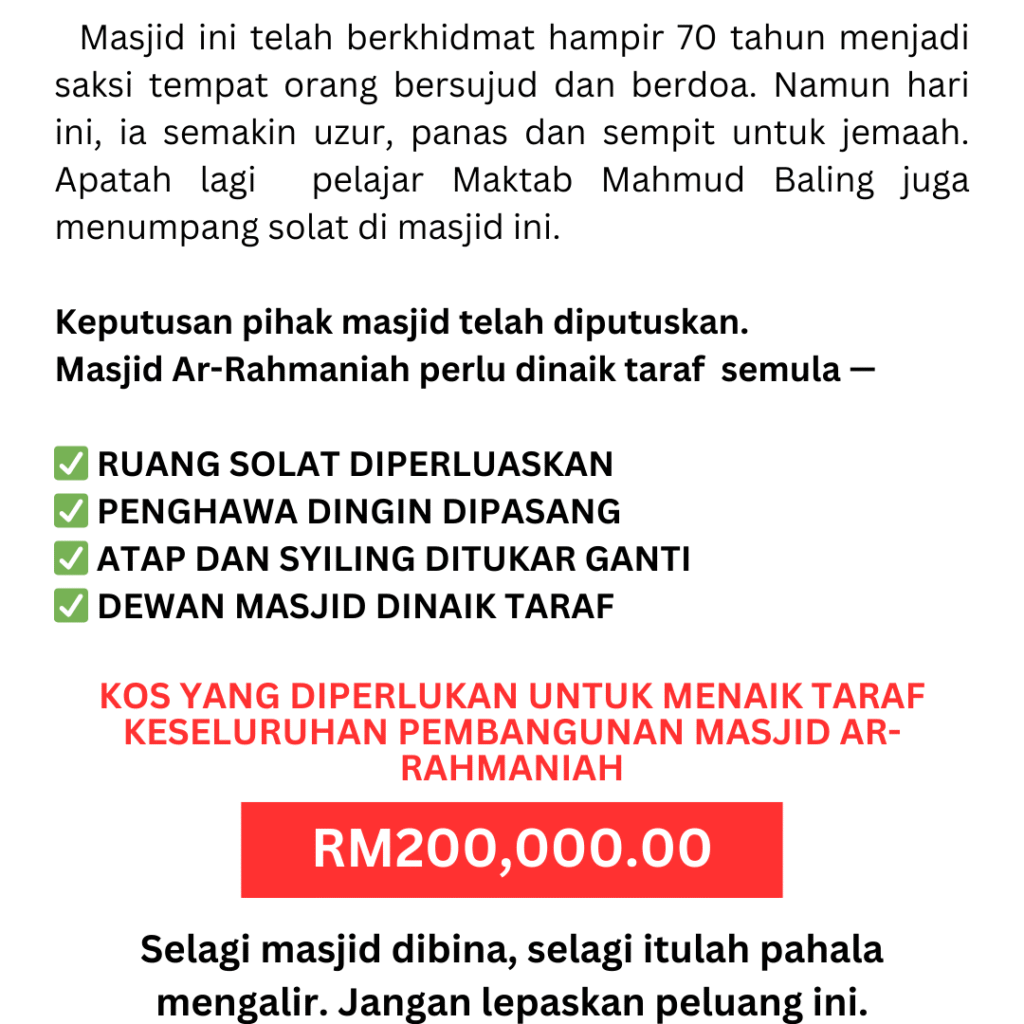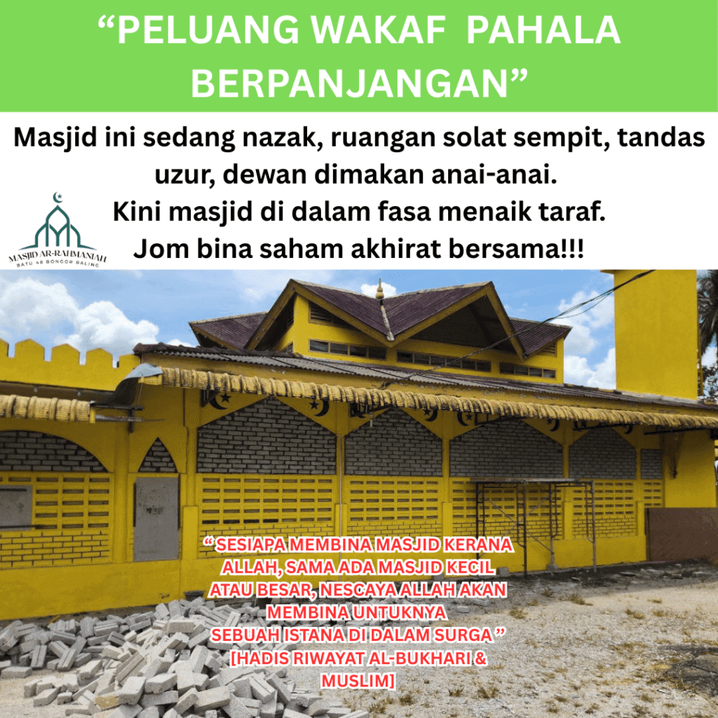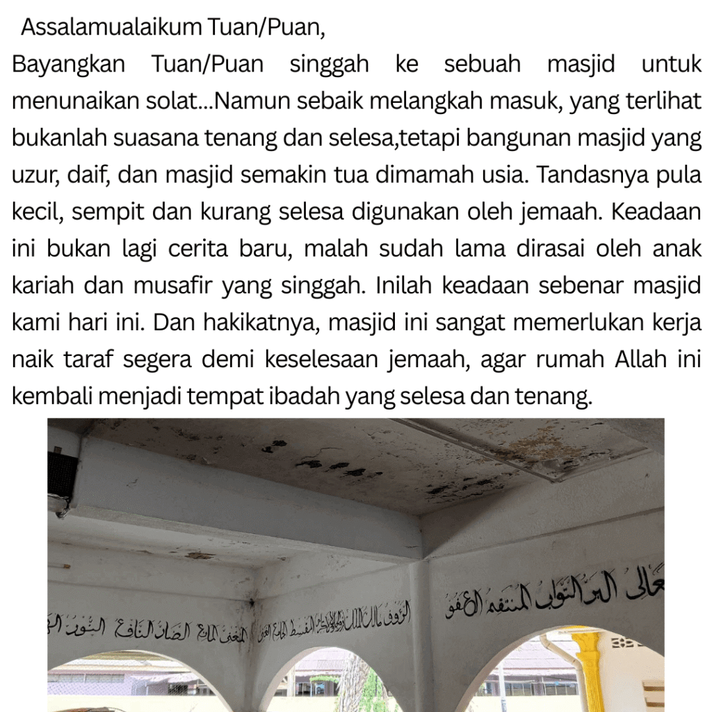 Setiap sumbangan yang diberikan, walaupun kecil, sangat bermakna untuk pembangunan dan pengimarahan rumah Allah. Mudah-mudahan derma ini menjadi amal jariah yang pahalanya terus mengalir, walau selepas kita tiada. Kami mendoakan agar Allah memberkati anda dan keluarga, dikurniakan kesihatan yang baik serta rezeki yang diluaskan. Derma mengikut kemampuan dengan penuh keikhlasan, insyaAllah setiap ringgit dibalas dengan kebaikan berlipat ganda.